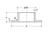 呼び径(kg) | 5K (kg) | 10K (kg) | 外径 OD(mm) | 厚さ T(mm) | つばの径 G(mm) | 高さF(mm) | コーナーR(mm) | |||